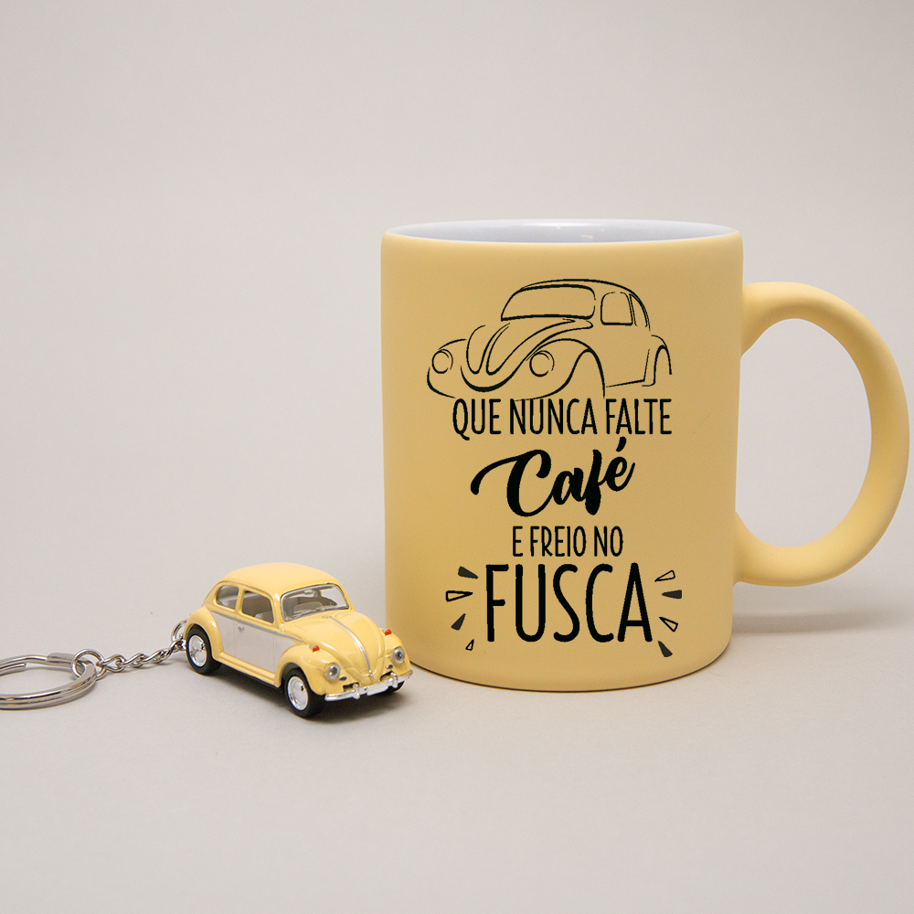 Caneca com Aproximadamente 325 ml e chaveiro do fusca em metal com rodas de borracha com aproximadamente 5cm.