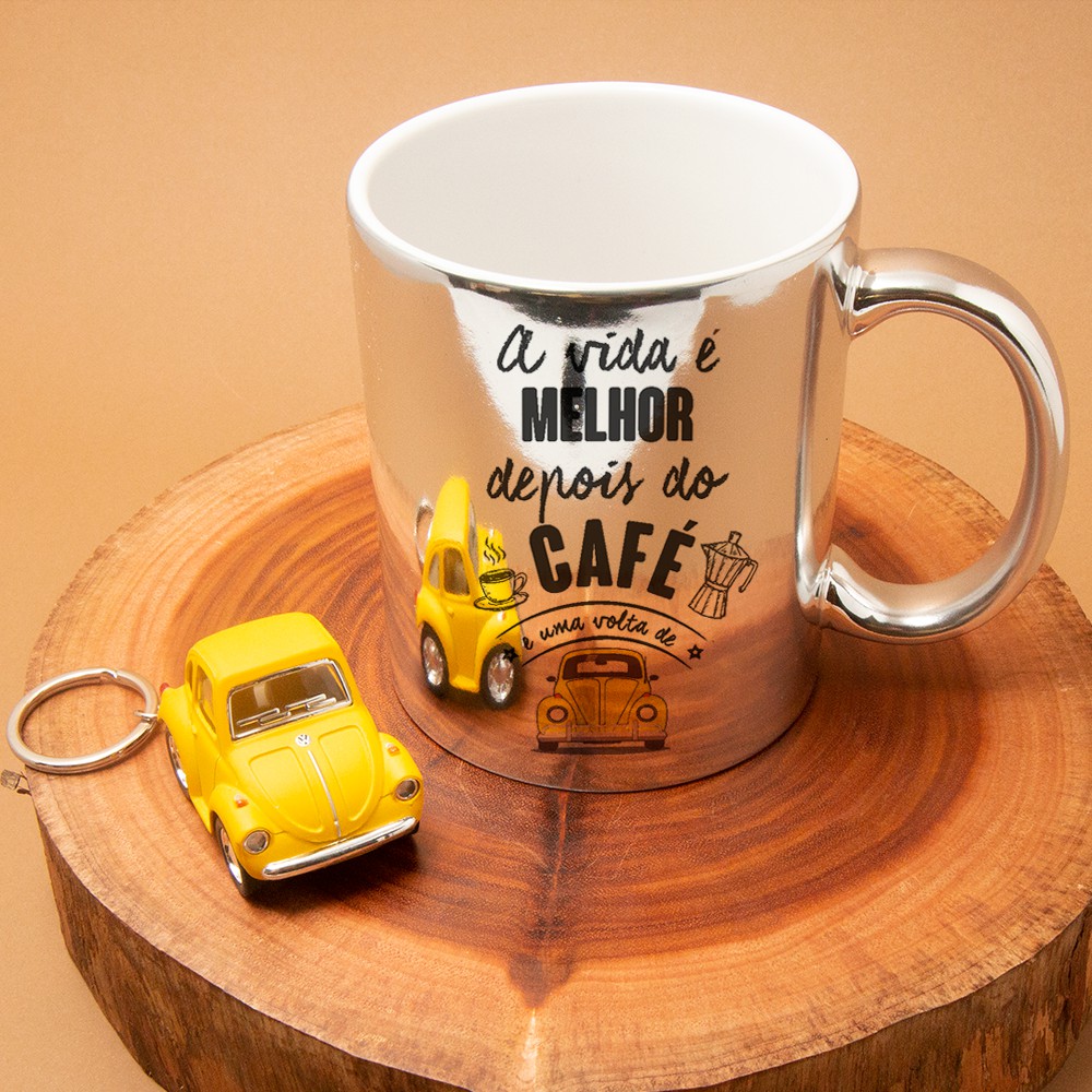 Kit Caneca Espelhada 350 ML de cerâmica com desenho A Vida é melhor depois do café e uma volta de Fusca. e Chaveiro Fusca Amarelo em metal com pneus de borracha. Um presente para quem gosta de fusca.