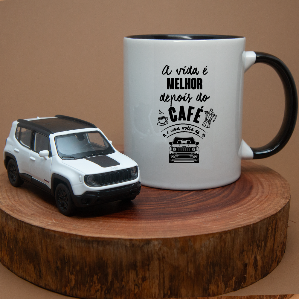 A miniatura traz todos os detalhes que fazem do Renegade um sucesso: visual compacto, linhas marcantes, faróis redondos e presença forte. Já a caneca estampa o modelo com muito estilo e é ideal para quem curte começar o dia com café e pegada Jeep. Por ser espelhada, a caneca não deve ir ao micro-ondas.