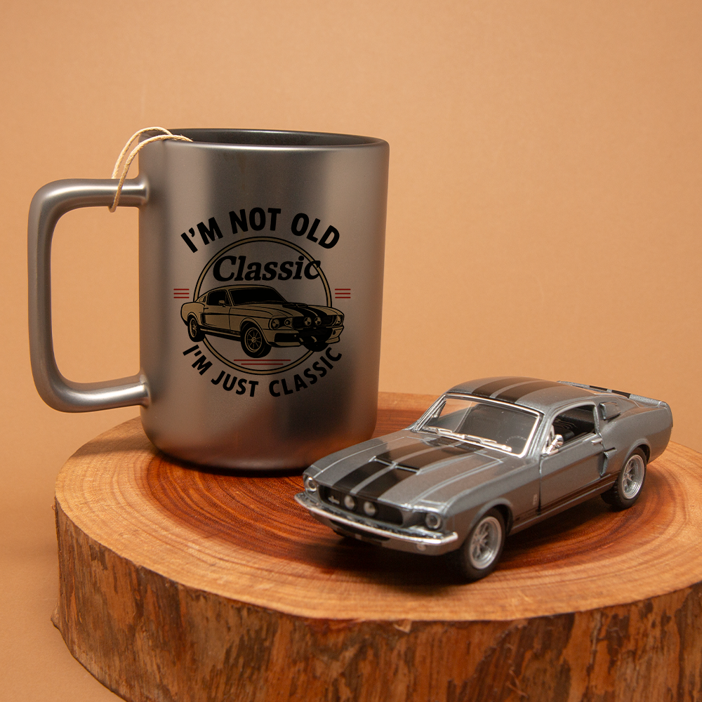 A caneca de 300ml traz uma arte vintage inspirada em pôster retrô: o GT500 em destaque com visual agressivo e 4 faróis frontais (incluindo os 2 faróis adaptados na grade), acompanhado da frase estilo “classic” em fonte preta, garantindo um design forte e elegante. Ideal para café, chá ou aquela pausa com clima de garagem old school.