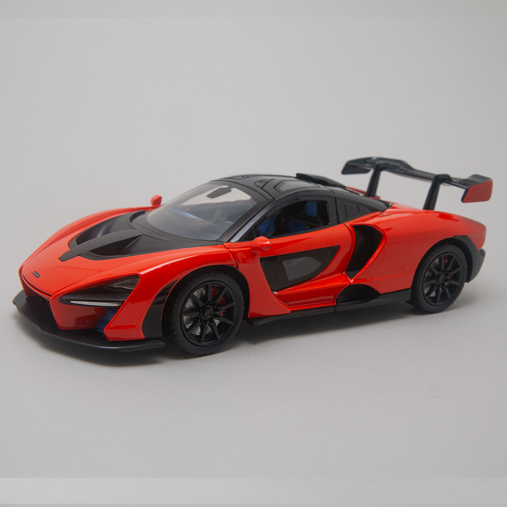 Construída em metal (diecast) com acabamento premium, a miniatura apresenta pintura metálica brilhante, interior detalhado e portas que se abrem, revelando o cockpit esportivo da McLaren.
