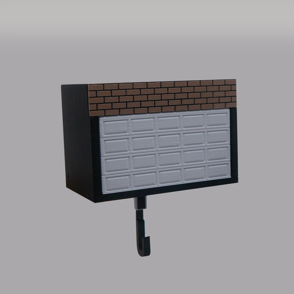 Produzido em impressão 3D de alta precisão, o modelo simula uma garagem residencial real, com textura de parede em tijolos e portão basculante funcional — permitindo guardar a chave dentro da garagem junto com seu carro favorito.